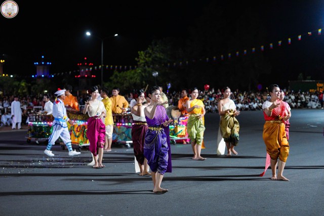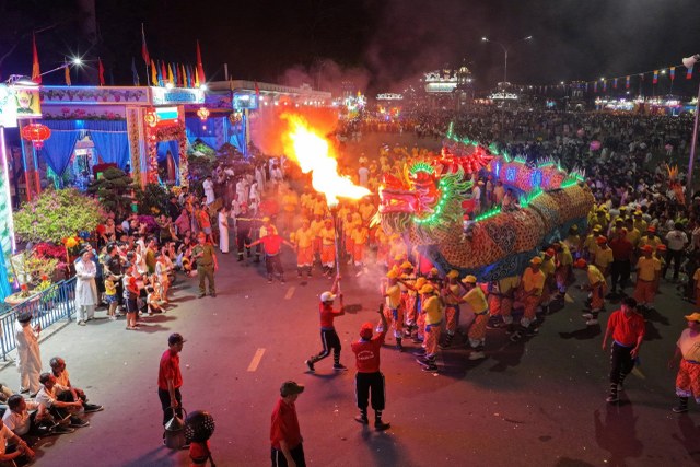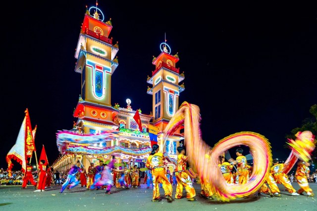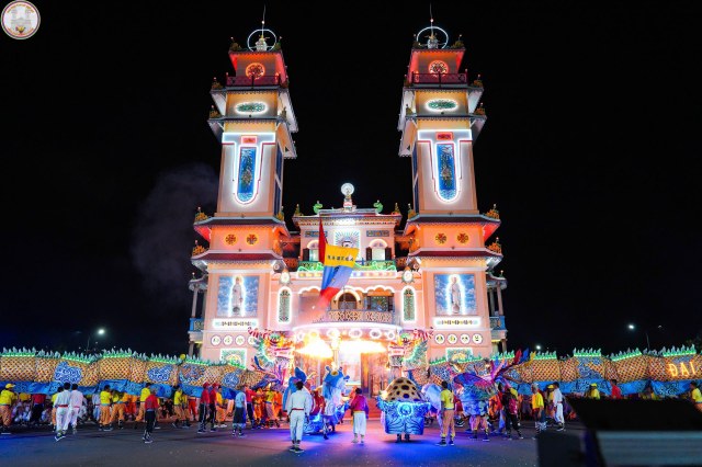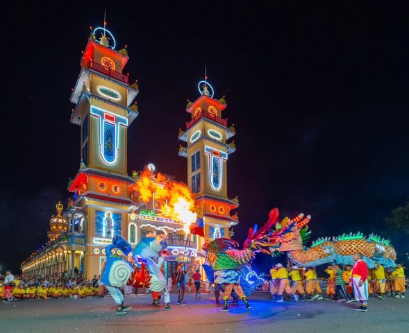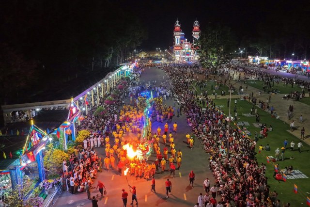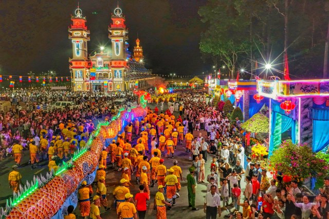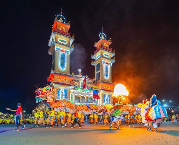 Kế đến, lúc 18g30, đoàn Hội Thánh cùng quý quan khách di chuyển đến sân lễ trước Đền Thánh để dự khán màn diễn hành Long Mã, Tứ Linh (Long Lân Qui Phụng), đội nhạc sắc tộc và các đội nghệ thuật tiến từ Báo Ân Từ hướng về Đền Thánh và biểu diễn 02 vòng xung quanh Đại Đồng Xã. Toàn đạo và khách thập phương đứng xem dọc theo Đại lộ Phạm Hộ Pháp và hai bên đường Đông Tây khán đài, hai bên hông Đền Thánh ước lượng khoảng 50 ngàn người.