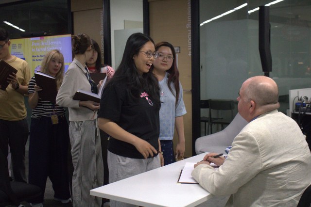 At 7:30 PM, concluding the program, Professor Christopher Hartney took the time to chat intimately and personally sign books for the students. The professor's approachability and erudition greatly inspired the attendees.