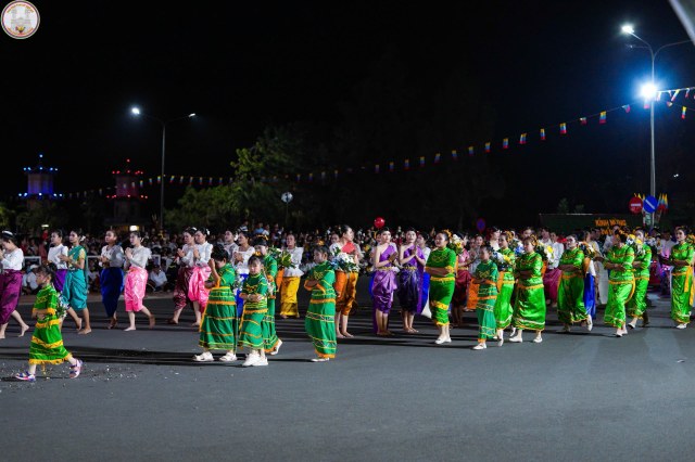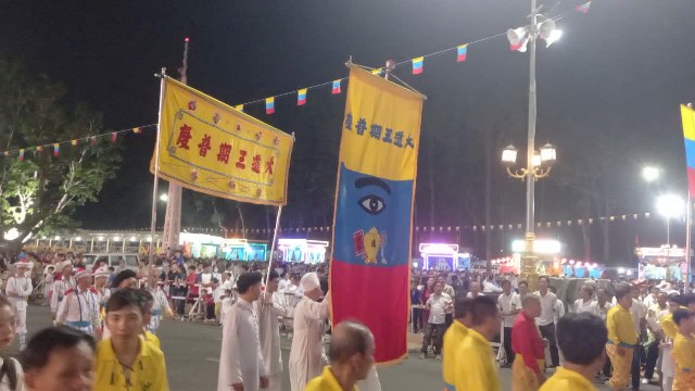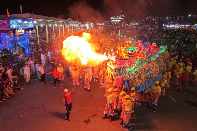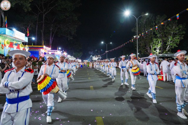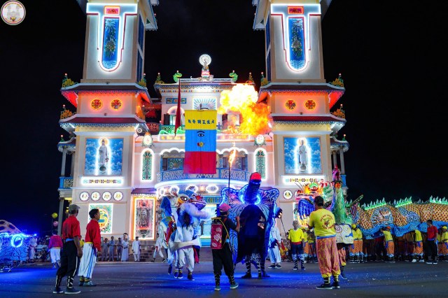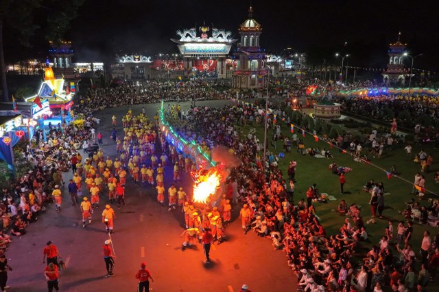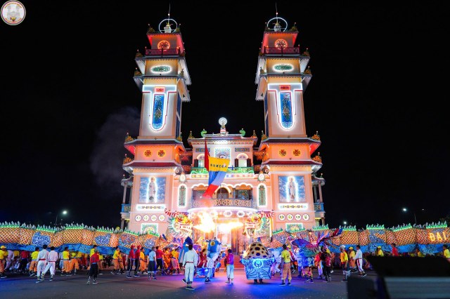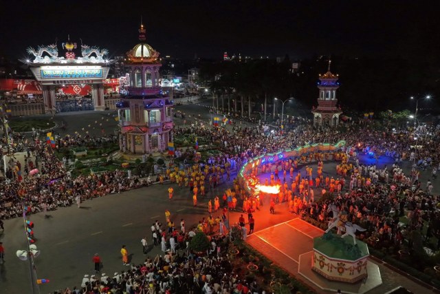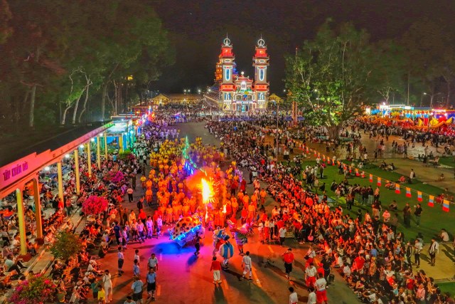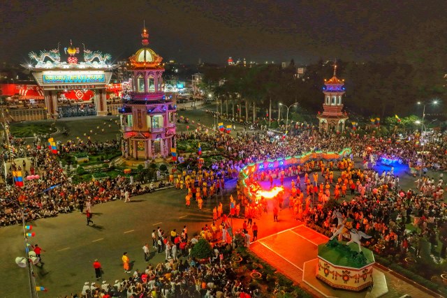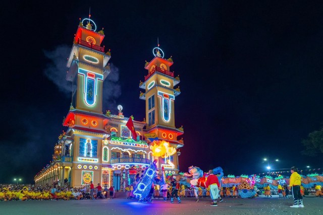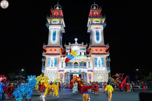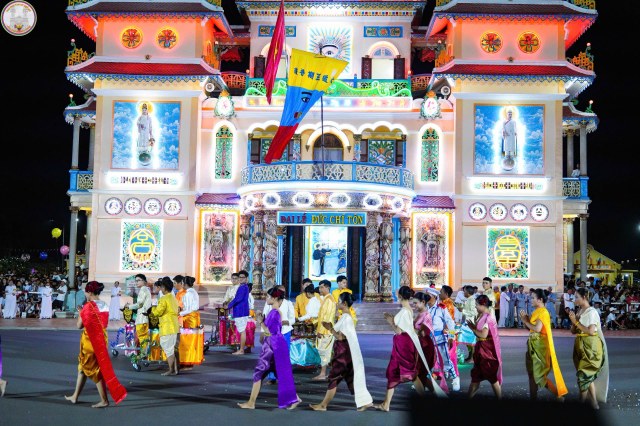 Kế đến, lúc 18g30, đoàn Hội Thánh cùng quý quan khách di chuyển đến sân lễ trước Đền Thánh để dự khán màn diễn hành Long Mã, Tứ Linh (Long Lân Qui Phụng), đội nhạc sắc tộc và các đội nghệ thuật tiến từ Báo Ân Từ hướng về Đền Thánh và biểu diễn 02 vòng xung quanh Đại Đồng Xã. Toàn đạo và khách thập phương đứng xem dọc theo Đại lộ Phạm Hộ Pháp và hai bên đường Đông Tây khán đài, hai bên hông Đền Thánh ước lượng khoảng 50 ngàn người.