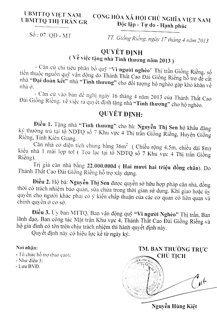 Ông Nguyễn Hùng Kiệt, Chủ tịch Ủy Ban MTTQ VN Thị Trấn Giồng Riềng, phát biểu cảm tưởng và đồng thời trao quyết định về việc giao cho Ban Cai Quản họ Đạo TT Giồng Riềng cất nhà cho hộ bà Nguyễn Thị Sen với nguồn kinh phí do họ đạo vận động và thi công, diện tích 36m2 (rộng 4,5m x dài 8m), mái tôle, nền lót gạch tàu, tổng kinh phí 22 triệu đồng.