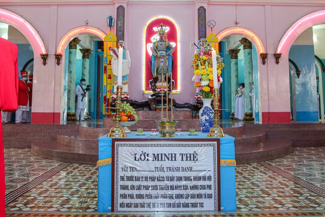 08 giờ 30 phút: Lễ Minh thệ của Chức sắc tân thăng, tân phong trước bàn Ngũ Lôi và Vi Hộ Pháp. Trước Chánh điện oai nghiêm, quý Chức sắc lập minh thệ tuần tự theo phẩm cấp từ phẩm Phối sư, Giáo sư và các phẩm tương đương, Giáo hữu và các phẩm tương đương, Lễ sanh và các phẩm tương đương, và quý Chức sắc Quản Nhạc, Đội Nhạc, Cai Nhạc và Bếp Nhạc.